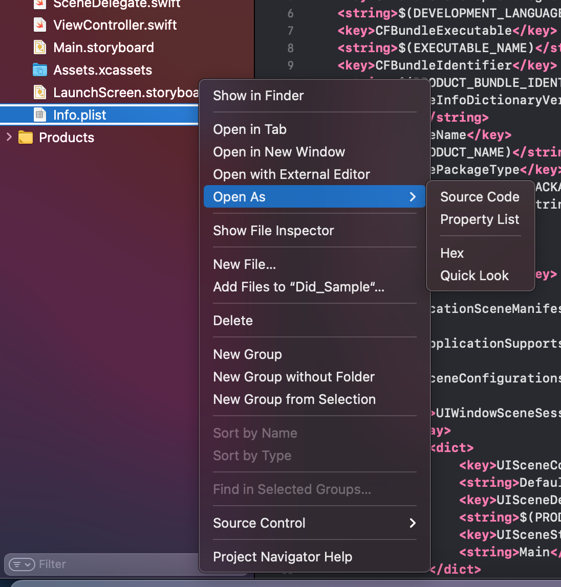 plist 메뉴에서 Open As > Source Code 를 선택 하면 xml형식의 소스 코드를 볼수 있다.