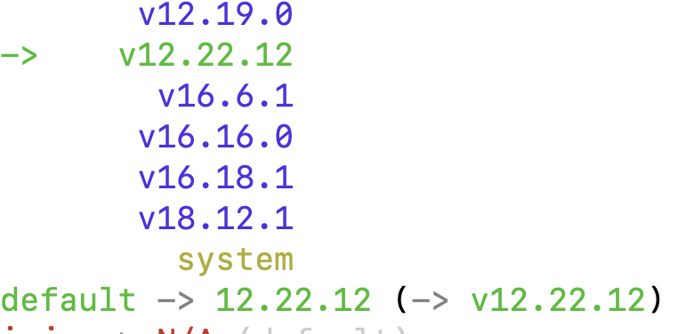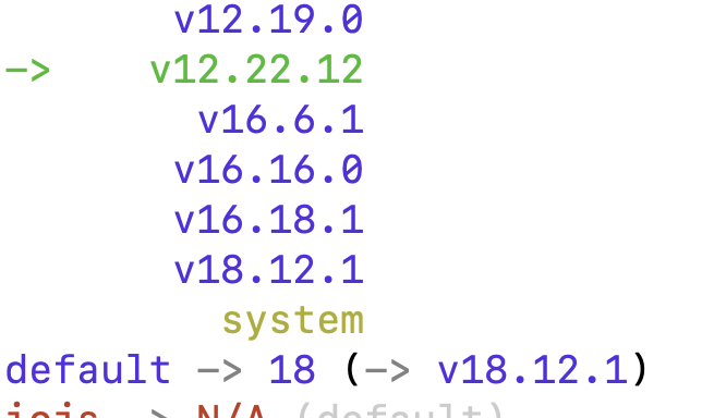 삽질 중 nvm 의 default버전이 v18.12.1로 되어 있어 있는데, 에러가 이부분에 연관된 것이 아닌가라는 의심이 들어 혹시나 하는 마음에 nvm default 버전을 변경해 보았다.